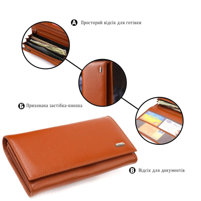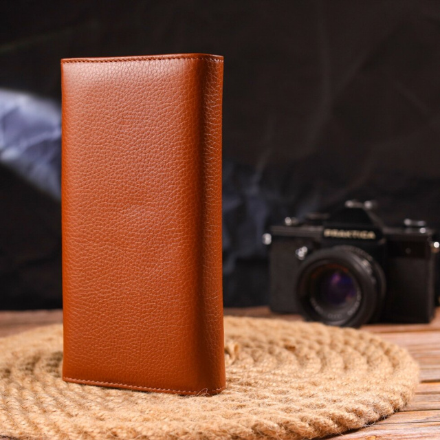 Зручний горизонтальний жіночий гаманець із натуральної зернистої шкіри, в стильному світло-коричневому кольорі. Аксесуар має три великі кишені для купюр, три прилеглі кишені, вісім осередків для карток, три з них під сіточкою, монетницю на блискавці. Виріб закривається клапаном на кнопку. Відмінна ідея для подарунка, яка не залишить байдужою жодну жінку.