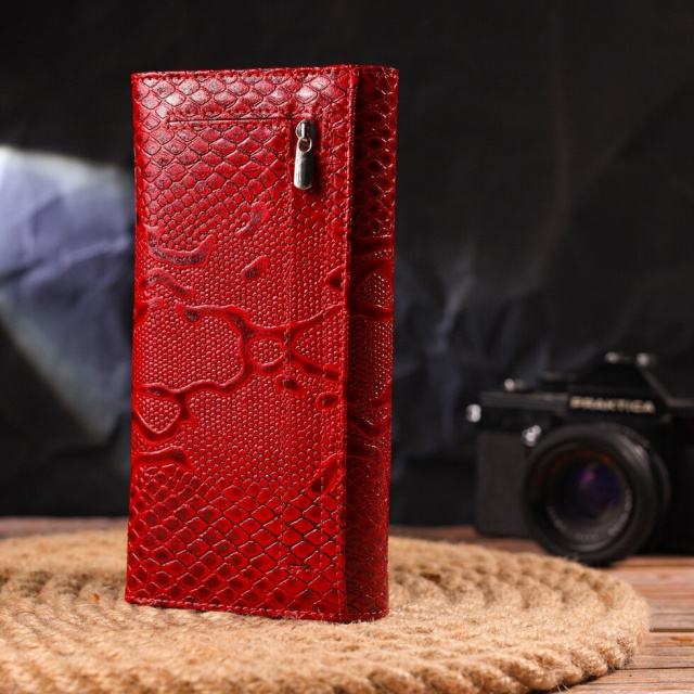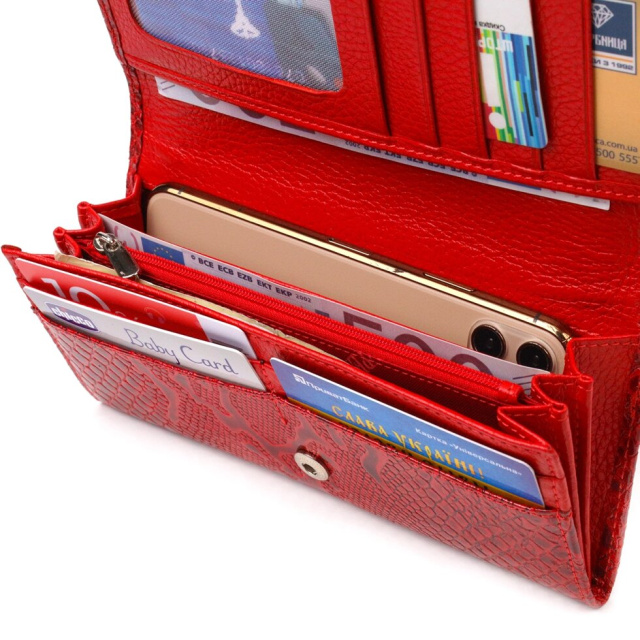 Лакований фактурний жіночий гаманець з натуральної шкіри з тисненням під рептилію. Аксесуар має три основні відділення, в які поміщаються купюри всіх номіналів, дві перегородки, одна з них на блискавці, одинадцять кишень для карток, одна з яких під сіточкою, монетниця на блискавці - зовні та одна прилегла кишеня. Закривається аксесуар клапаном на кнопку. Відмінний аксесуар, надійного виробника, який прослужить дуже довго.