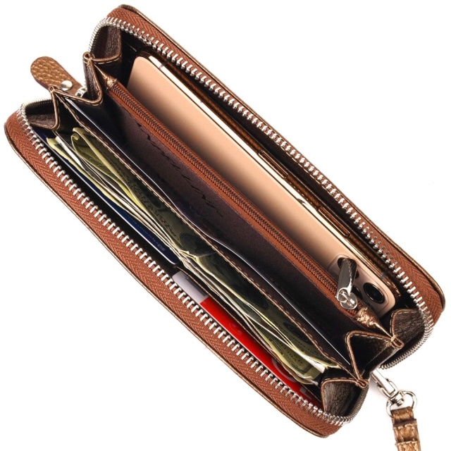 Дивовижний жіночий гаманець, з натуральної шкіри коричневого кольору з ледь вловимим золотавим блиском. Аксесуар має три основні відділення, в які поміщаються купюри всіх номіналів, дві перегородки, одна з них на блискавці, вісім кишень для карток, дві прилеглі кишені та знімний кистьовий ремінь. Закривається аксесуар на блискавку. Відмінний аксесуар, надійний виробник, який прослужить дуже довго.