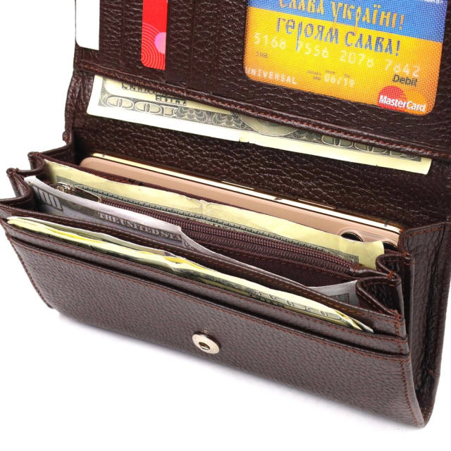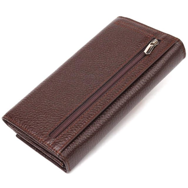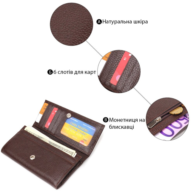 Якісний жіночий гаманець із натуральної шкіри. Аксесуар має три широкі відділення для купюр, з двома перегородками, одна перегородка закривається на блискавку, містку монетницю зовні, чотири приховані кишені та шість кишень для карток. Закривається аксесуар клапаном на кнопку. Якщо Ви хочете порадувати себе та здивувати близьких, то неодмінно купуйте шкіряні аксесуари в нашому магазині, якість і ціна Вас однозначно порадує.