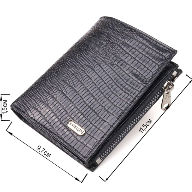 Стильний гаманець унісекс компактного розміру з натуральної шкіри, з тисненням під рептилію. Аксесуар має відділення для купюр, монетницю, що закривається на блискавку, дві приховані кишені та десять осередків для карток, один під сіточкою. Закривається аксесуар у два складання на кнопку. Якісний шкіряний аксесуар завжди вважався показником смаку та достатку, саме такі вироби представлені у нашому магазині, у нас кожен знайде щось для себе.