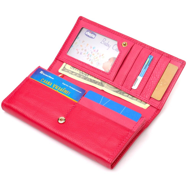 Стильний жіночий гаманець із натуральної якісної шкіри, у яскравому рожевому кольорі. Аксесуар має стильний дизайн та практичний функціонал. Фурнітура надійна та оформлена в золотистому відтінку, доповнюючи основний колір. Усередині достатньо місця для зручного розташування паперових купюр, банківських, дисконтних карток, візиток та документів, адже відділення просторі та виконані з текстилю. Гаманець упакований у фірмову коробку від виробника.