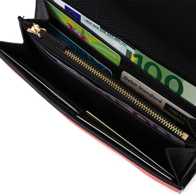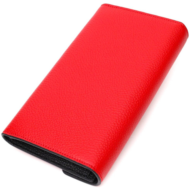 Стильний місткий жіночий гаманець із натуральної шкіри, у комбінації з двох кольорів червоного зовні та чорного всередині. Аксесуар складається з двох широких відділень для купюр, дванадцяти осередків для пластикових карток, двох прилеглих кишень та монетниці на блискавці. У виробі використано якісну фурнітуру золотистого кольору. Закривається гаманець трикутним клапаном на кнопку. Купуючи цей шкіряний гаманець, Ви не тільки набуваєте стильної речі, але й отримуєте якісний аксесуар, який прослужить не один рік.