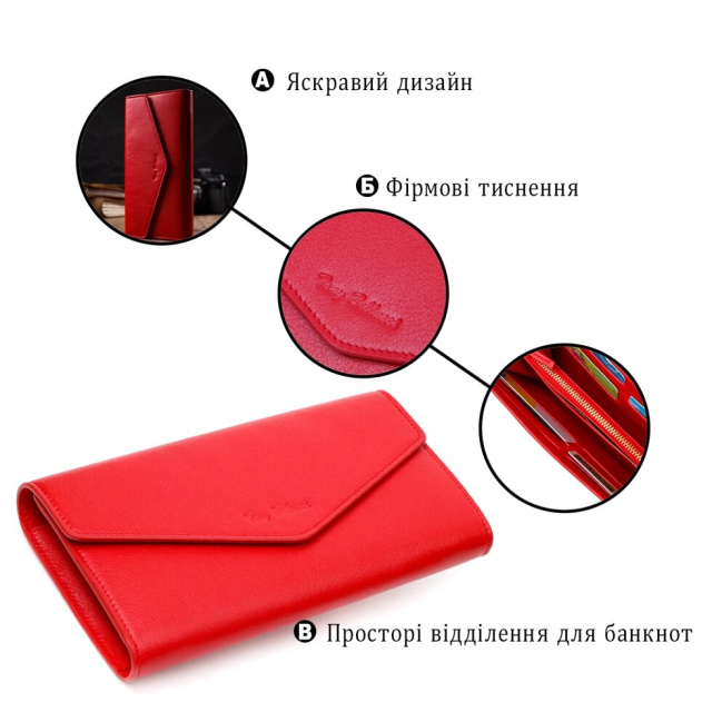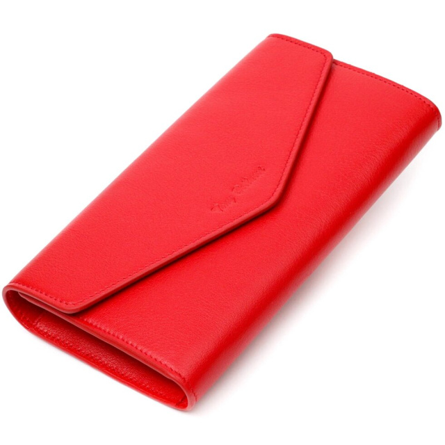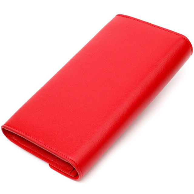 Стильний місткий жіночий гаманець із натуральної шкіри. Аксесуар складається з двох широких відділень для купюр, дванадцяти осередків для пластикових карток, двох прилеглих кишень та монетниці на блискавці. У виробі використано якісну фурнітуру золотистого кольору. Закривається гаманець трикутним клапаном на кнопку. Купуючи цей шкіряний гаманець, Ви не тільки набуваєте стильної речі, але й отримуєте якісний аксесуар, який прослужить не один рік.