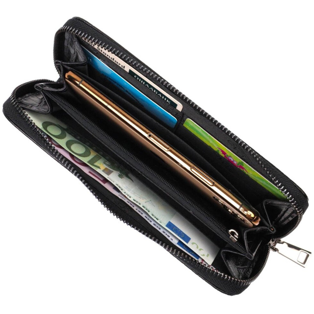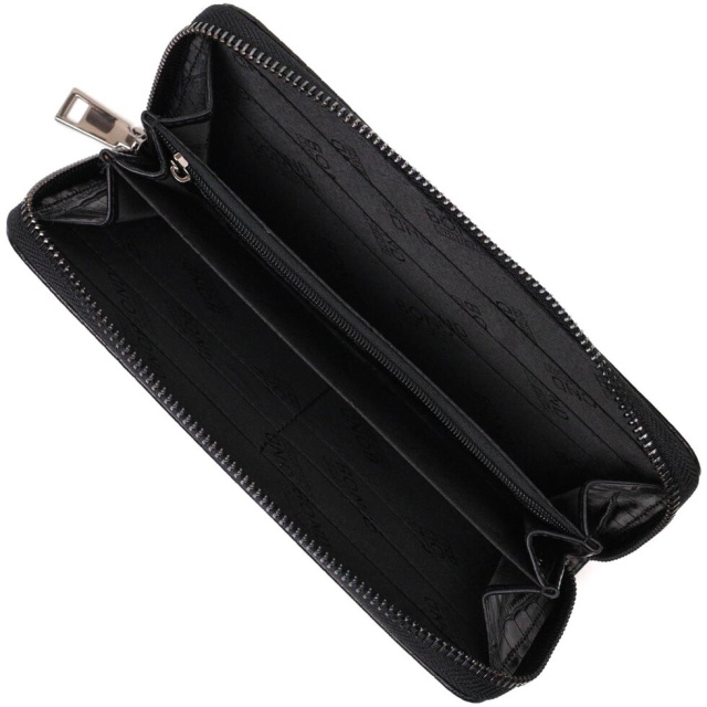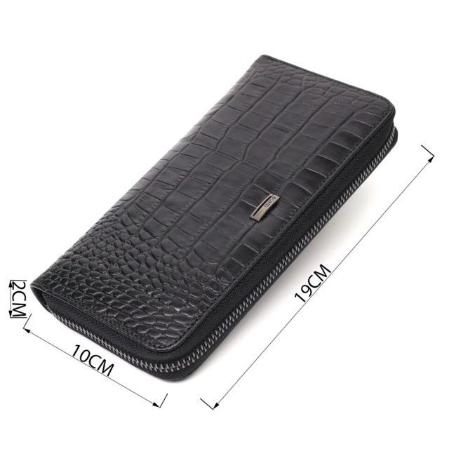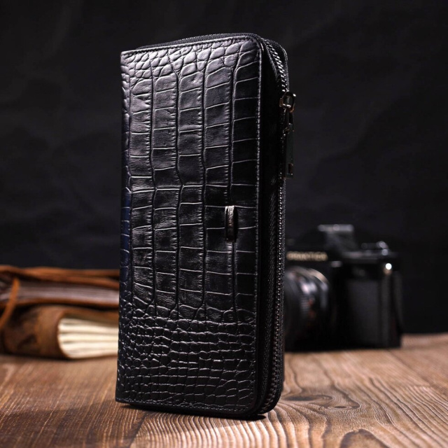 Місткий гаманець для сучасних жінок із натуральної шкіри з тисненням під крокодила. Аксесуар складається з трьох відділень для купюр, шести осередків для пластикових карток, трьох прилеглих кишень та монетниці. У виробі використано якісну фурнітуру. Закривається гаманець на блискавку. Якісний і надійний гаманець - саме такий аксесуар повинен бути у кожної людини, що поважає себе.