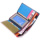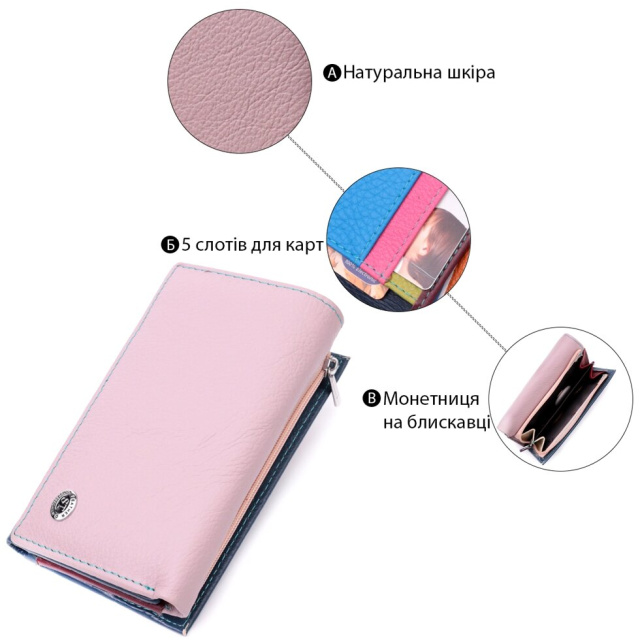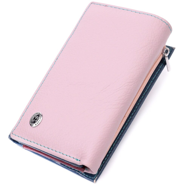Оригінальне жіноче портмоне в три складання зручного середнього розміру з натуральної шкіри найвищої якості. Перше, що впадає в око це колірне рішення, замість однотонного аксесуара ми маємо різнокольоровий, який містить два основні зовнішні кольори - фіолетовий і синій і кілька додаткових усередині. Шкіряне портмоне дуже практичне і служить досить довго. Аксесуар складається з двох містких кишень для купюр, кишені на блискавці через всю довжину, п'яти осередків для карт, прозорого віконця для пропуску та зовнішньої кишені на блискавці з перегородкою, що чудово прослужить для монет. Портмоне доповнено надійною фурнітурою. Укомплектований гаманець у фірмову картонну коробку білого кольору. Виріб стане ідеальним подарунком для дівчини будь-якого віку