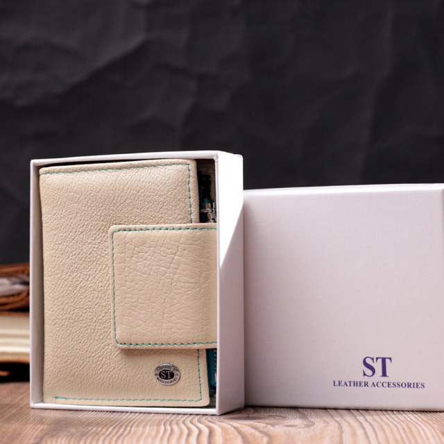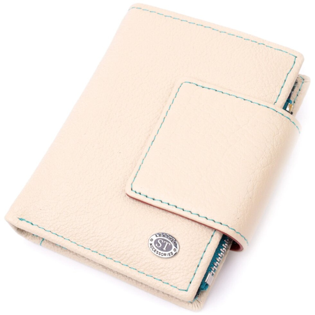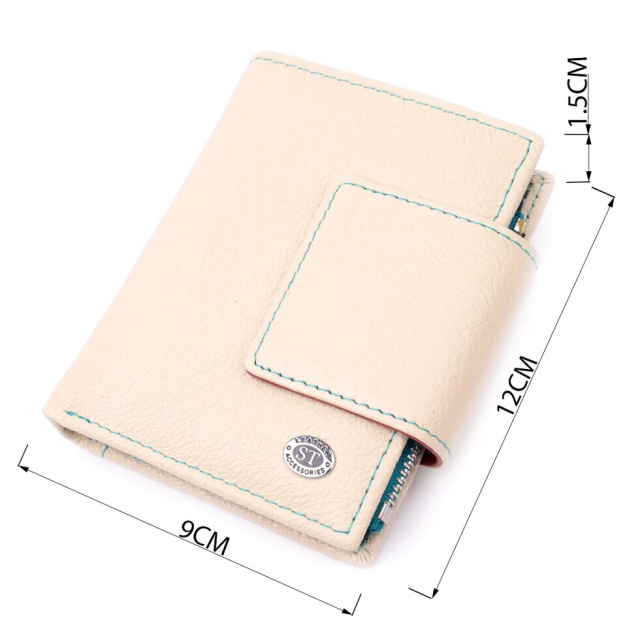 Стильне вертикальне портмоне в два складки зручного розміру з натуральної шкіри найвищої якості. Гаманець кремово-білого кольору зовні та різнобарвний усередині, що дуже стильно та сучасно. Шкіряне портмоне дуже практичне і служить досить довго. Аксесуар складається з основного відділення зі шкіряною перегородкою для купюр, монетниці, чотирьох осередків для карт, прозорого віконця для пропуску та чотирьох прихованих кишень. Портмоне доповнено надійною фурнітурою і прошито по краю рівним рядком бірюзового кольору. Укомплектований гаманець у фірмову картонну коробку білого кольору. Виріб стане ідеальним подарунком для дівчини будь-якого віку.