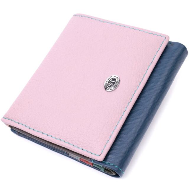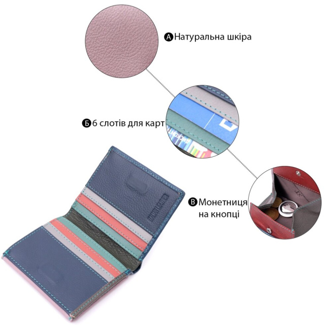 Оригінальний гаманець для жінок у два складення з натуральної шкіри найвищої якості. Фішкою цього гаманця є його багатобарвна гама, такий аксесуар одразу впадає у вічі, складається він з двох містких відділень для купюр, шести осередків для карт, двох прихованих кишень та кишені для монет. Зовні виріб прошитий рівним рядком бірюзового кольору по краю і прикрашений металевим логотипом компанії виробника. Портмоне доповнено надійною фурнітурою та міцною підкладкою. Укомплектований гаманець у фірмову картонну коробку білого кольору.
