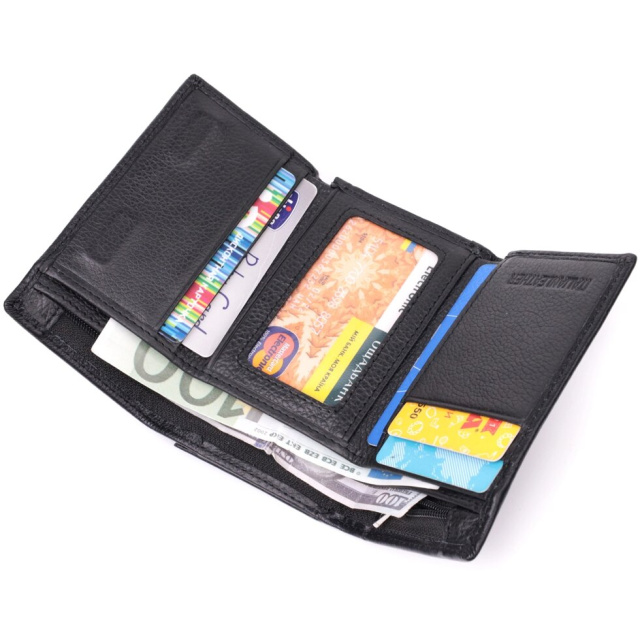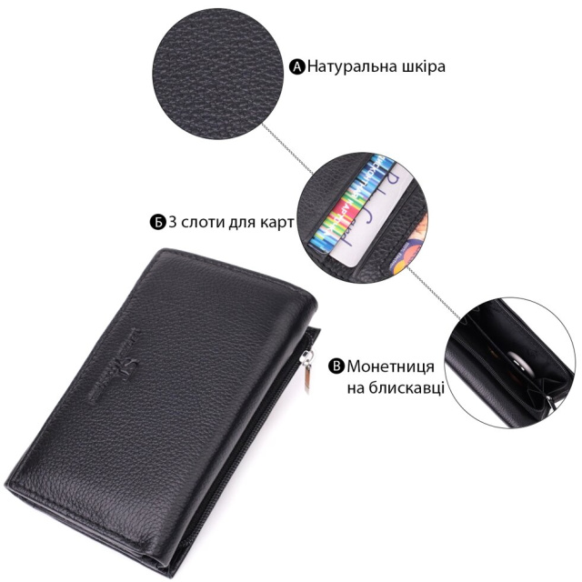 Жіноче портмоне в три складання зручного середнього розміру з натуральної шкіри найвищої якості. Шкіряне портмоне дуже практичне і прослужить досить довго. Аксесуар складається з двох містких кишень для купюр, кишені на блискавці через всю довжину, трьох осередків для карт, прозорого віконця для пропуску, двох прихованих кишень та монетниці. Портмоне доповнено надійною фурнітурою. Укомплектований гаманець у фірмову картонну коробку білого кольору. Виріб стане ідеальним подарунком для дівчини будь-якого віку.