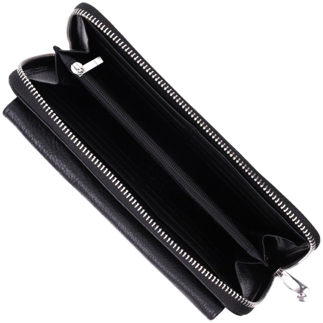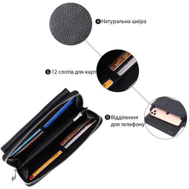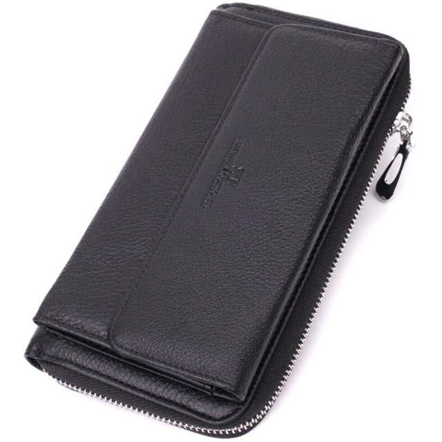 Якісний гаманець з натуральної шкіри, в класичному чорному кольорі, з використанням добротного текстилю (внутрішня підкладка). Використовується якісна фурнітура кольору срібла. Клатч одночасно, компактний і функціональний, в нього можна помістити свій телефон, щоб не заважав в руках. Запаковано у фірмову коробку білого кольору.