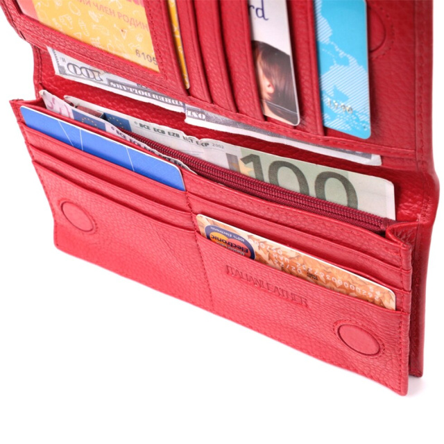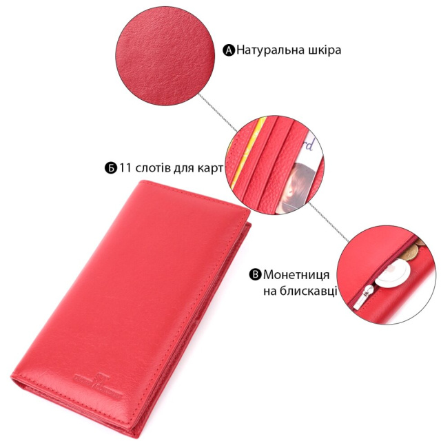 Яскравий жіночий гаманець вертикального формату із натуральної добротної шкіри. Аксесуар складається з двох відділень для купюр, кишені на блискавці всередині, одинадцяти осередків для пластикових карток, двох прихованих кишень, однієї кишені під плівкою та монетниці, зовні. З таким гаманцем Ви проходите не один рік. Модель упакована в коробочку, що дуже зручно, якщо виріб призначений для подарунка.