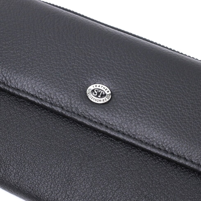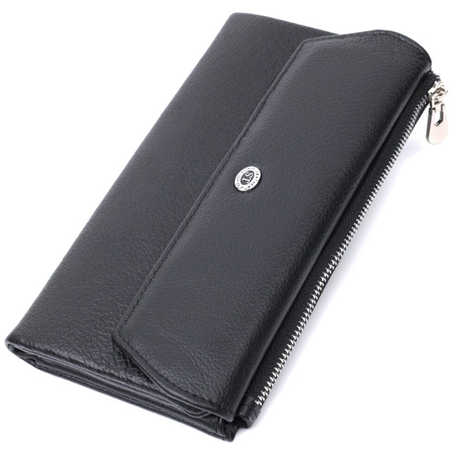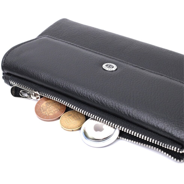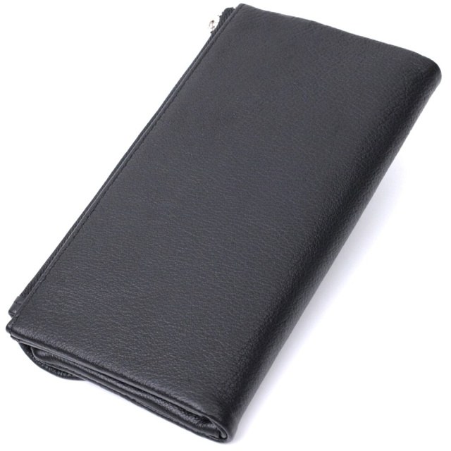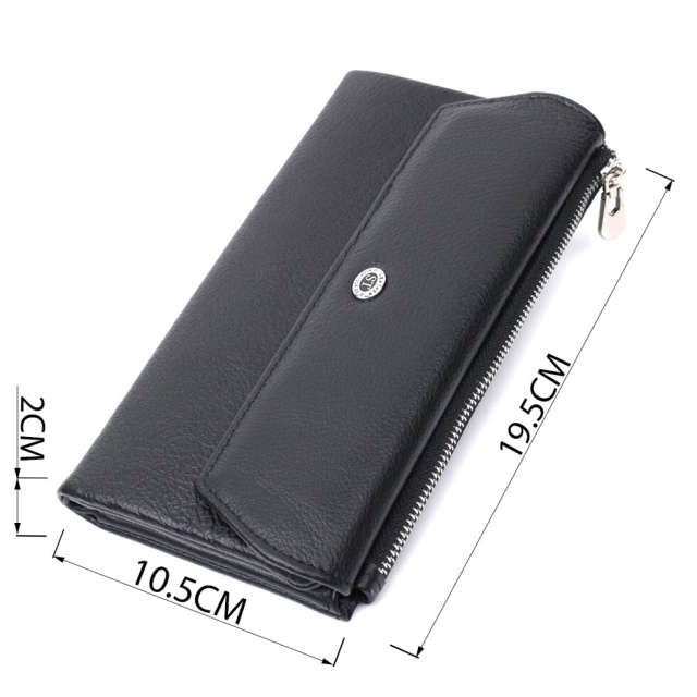 Стильний місткий гаманець для жінок із натуральної якісної шкіри. Модель має великий розмір та закривається на магніт. Зовні можна побачити відділення для монет, що закривається на блискавку. Зовні виріб прошитий рівним рядком по краю і прикрашений металевим логотипом компанії виробника, який розміщений на клапані посередині. Портмоне доповнено надійною фурнітурою та міцною підкладкою. Запакований аксесуар у білу щільну картонну коробку з фірмовим логотипом.