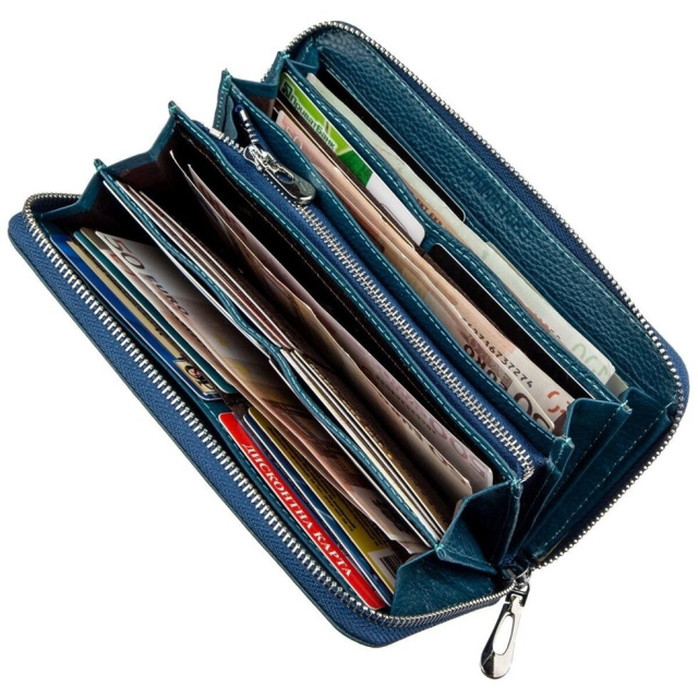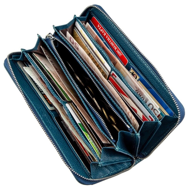 Чудовий багатофункціональний клатч для сучасних ділових жінок. Виконаний з натуральної високоякісної шкіри, ніжною і м'якою на дотик. Має стильний і модний дизайн, а особливий шарм надає гаманцю освіжаючий колір морської хвилі. Головною відмінною характеристикою є величезна кількість кишень для різних карток і візиток, таких є аж тридцять шість штук. Тому клатч гордо можна називати також і візитниця. Вас неодмінно порадують багато різних відділень для купюр і інших цінностей. Для швидкого доступу до дрібниці, монетниця розташована на зовнішній стороні клатчу і закривається на блискавку. Упаковано виріб в білу щільну картонну коробку з фірмовим логотипом.