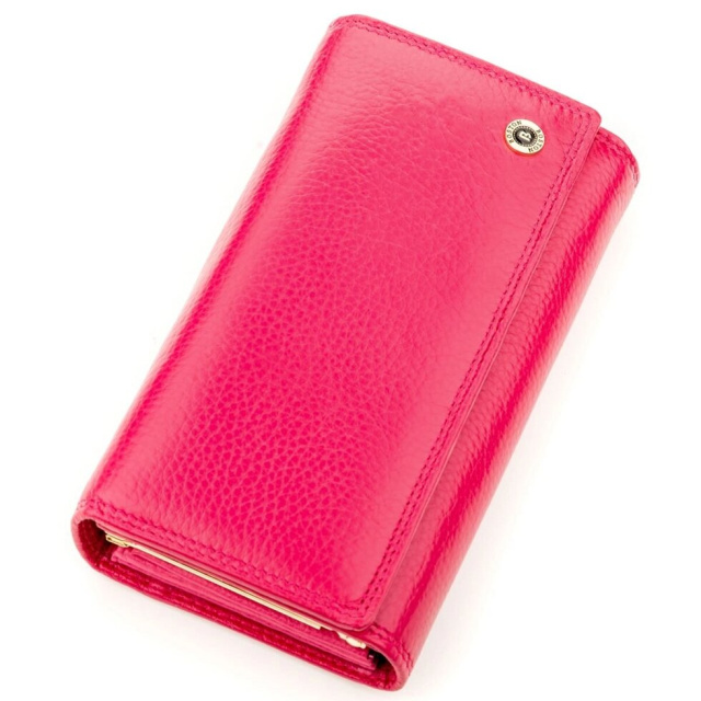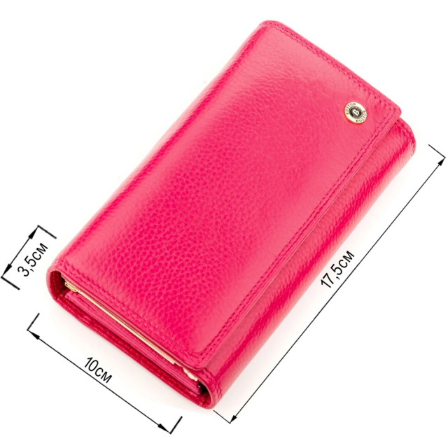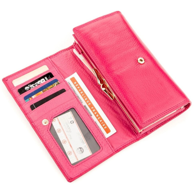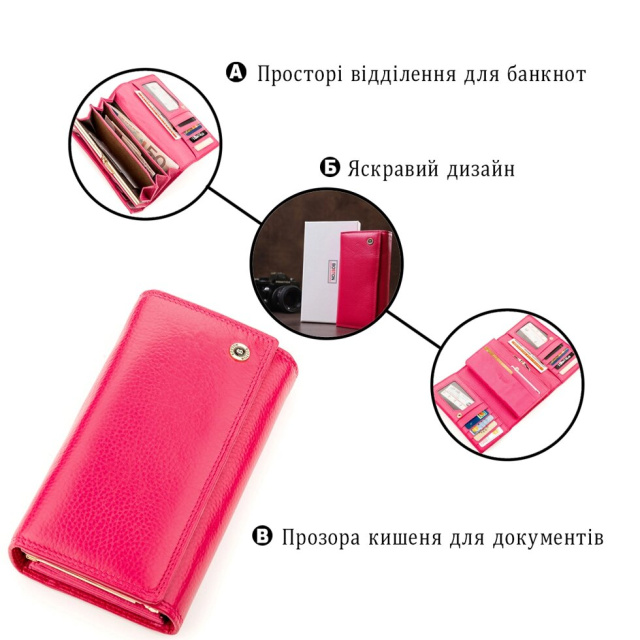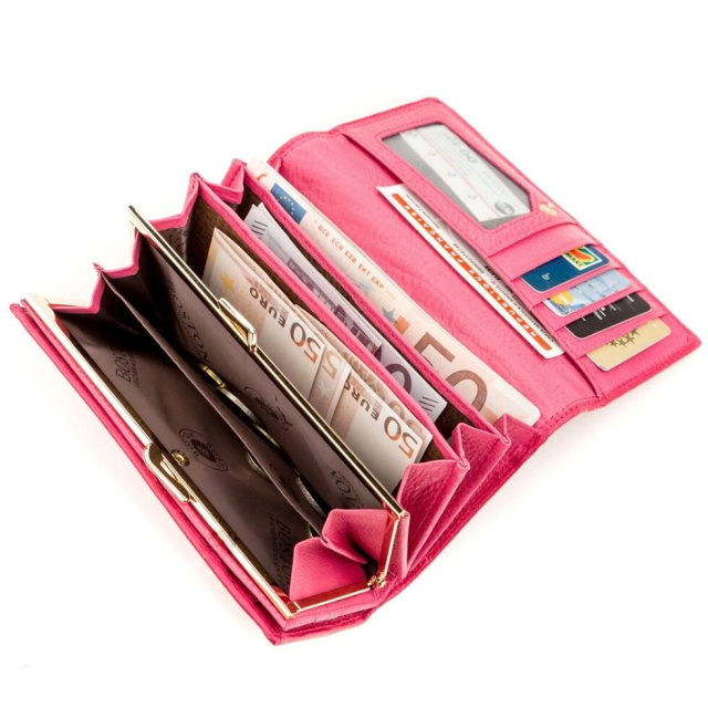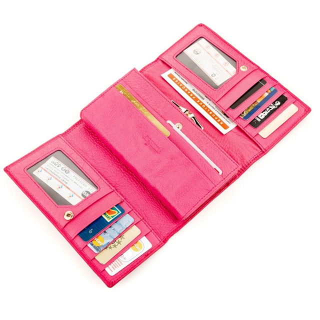 Запропонована модель виготовляється з міцної і зносостійкої шкіри, фіксується на кнопку і оформлений в ніжному рожевому кольорі. Завдяки зручному розвороту є доступ до всіх відділень та слотів, а також є додатковий блок для платіжних карт. Гаманець місткий і зручно розташовується в руках, кишенях і сумочці. Додатково порадує і фірмова коробка, яка має гарний вигляд.
