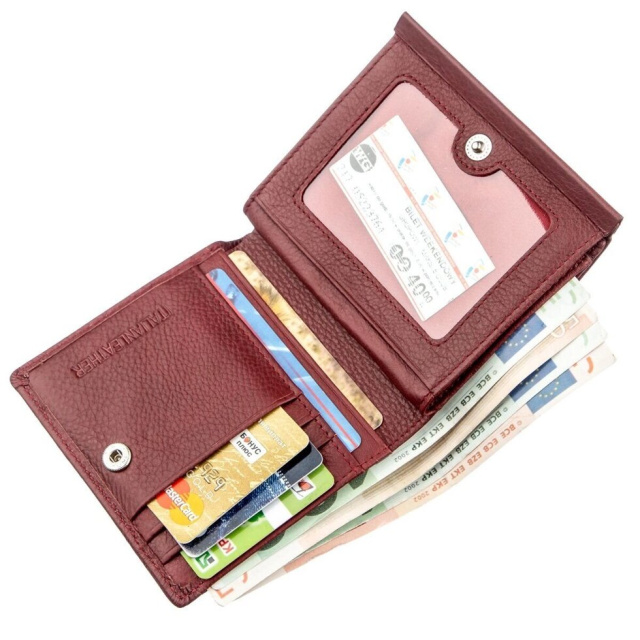Відмінний жіночий гаманець невеликого розміру для практичних жінок. Зроблений він з натуральної шкіри високої якості, найвищого гатунку, яка має відмінні експлуатаційні властивості. Колір гаманця насичено бордовий. Якщо Ви не любите носити з собою великі і незручні гаманці, то дана модель прекрасно Вам підійде, адже вона компактна і функціональна. Усередині присутні відділення для купюр, карток і візиток, фото улюблених людей і іншого дріб'язку. Монетниця закривається на кнопку і розташована на зовнішній стороні аксесуара. Сам гаманець також закривається на металеву кнопку. Упаковано виріб в картонну білу коробку.