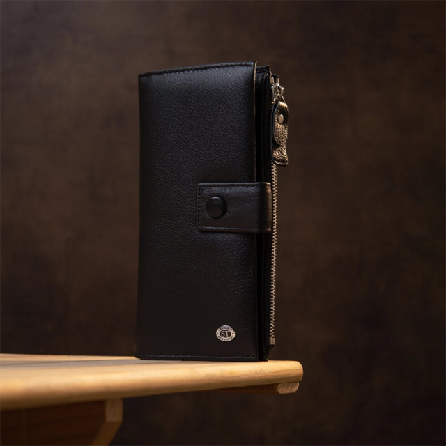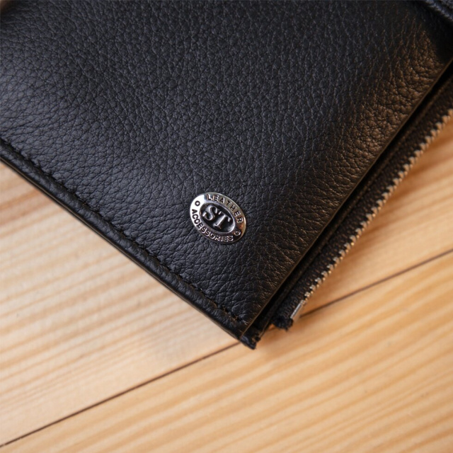 Гарний і функціональний гаманець-клатч в класичному чорному кольорі. Виконаний з натуральної шкіри високої якості, має матову зернисту фактуру і дуже приємний на дотик, що важливо при щоденному використанні. Всередині має багате наповнення у вигляді безлічі кишень і відділень, також є зовнішня монетниця на блискавці. Упакований клатч в тверду фірмову упаковку.
