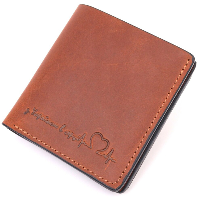 Добротний шкіряний гаманець, світло-коричневого кольору з патріотичним написом "З Україною в серці". Виріб пошитий із якісної гладкої шкіри, з високими показниками зносостійкості. Портмоне має два великих відділення для купюр усіх номіналів, а також достатню кількість відділень для карток та монетницю, застібається виріб на надійний магніт. Шкіряний гаманець стане чудовим подарунком на всі випадки життя.