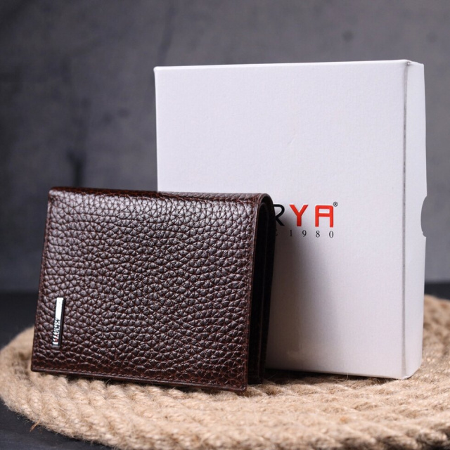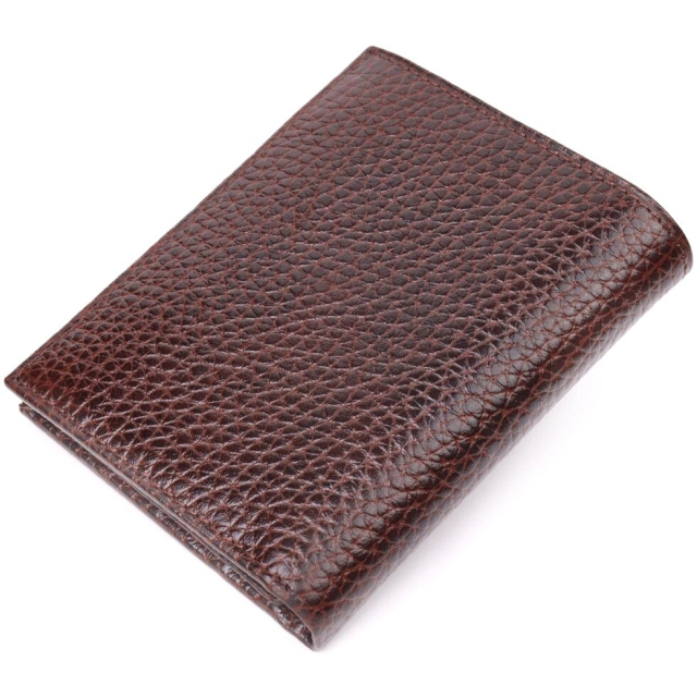 Практичний портмоне з крупнозернистої натуральної шкіри в сучасному дизайні та красивому коричневому кольорі. Такий аксесуар оцінять любителі натуральних та якісних речей, виріб виконаний з натуральної шкіри високої якості. Портмоне має містке відділення для купюр, слоти для пластикових карток та монетницю. Цей аксесуар чудово підійде як подарунок і принесе виняткову радість близькій людині.