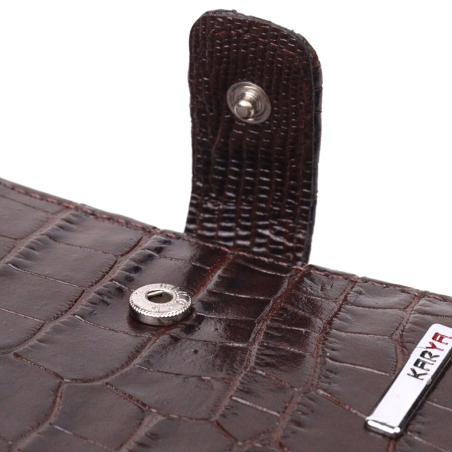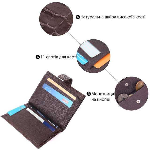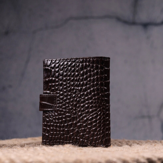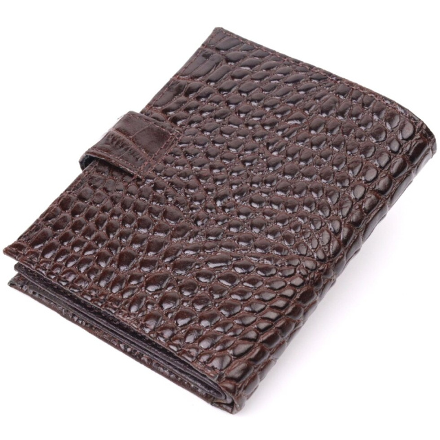 Тонкий компактний портмоне з натуральної шкіри з тисненням під крокодила, що закривається хлястиком на кнопку. Виріб має велику кишеню для купюр. Усередині достатньо осередків для кредиток. Виріб продуманий для сучасної людини. Виріб має насичений коричневий колір. Оригінальний аксесуар вигідно виділить вас із натовпу. Гаманець стане чудовим подарунком для Ваших близьких.