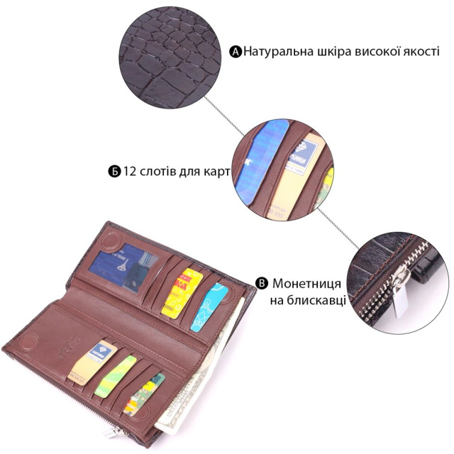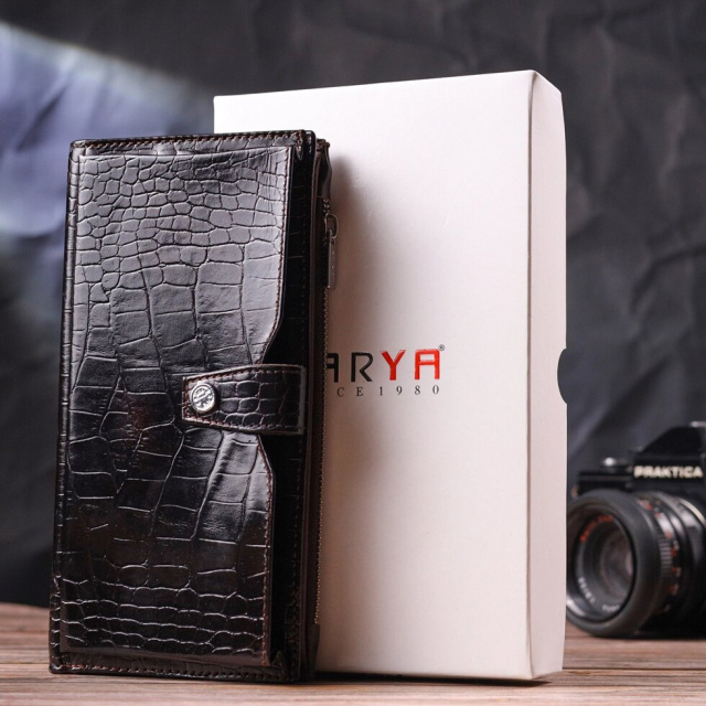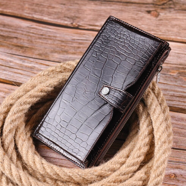 Гідний гаманець з натуральної фактурної шкіри, з тисненням під крокодила, у насиченому коричневому кольорі. Гаманець складається з одного глибокого відділення, чотирьох прилеглих кишень, дванадцяти осередків для карт, відділення під сіточкою, відділення на блискавці зовні та відділення для телефону, що закривається хлястиком на кнопку. У виробах цього елітного турецького бренду завжди використовуються найякісніші шкіряні матеріали та фурнітура. Аксесуар упакований у фірмову коробочку. Шкіряний виріб завжди буде чудовим подарунком для будь-якого чоловіка.