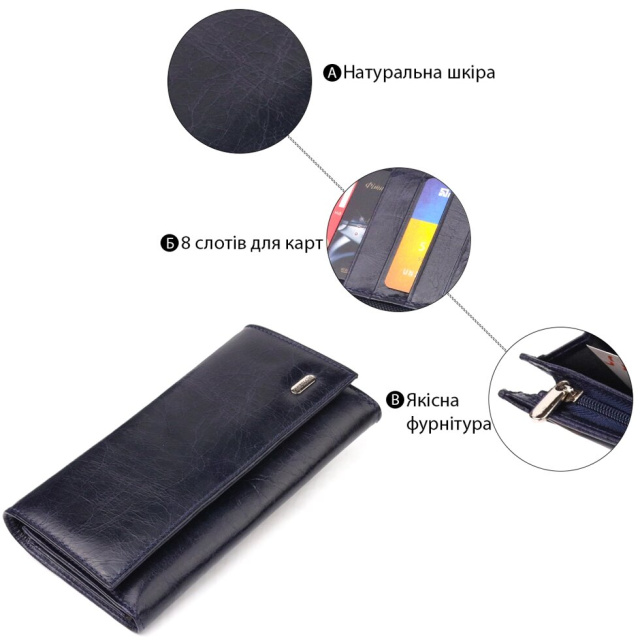 Чудовий горизонтальний жіночий гаманець із натуральної гладкої шкіри, в стильному синьому кольорі. Аксесуар має три великі кишені для купюр, три прилеглі кишені, вісім осередків для карток, три з них під сіточкою, монетницю на блискавці. Виріб закривається клапаном на кнопку. Відмінна ідея для подарунка, яка не залишить байдужою жодну жінку.