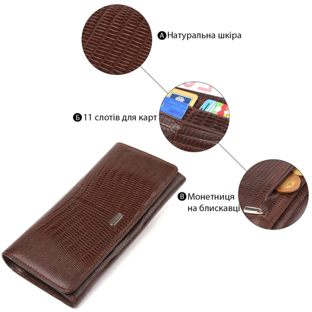 Стильний фактурний жіночий гаманець з натуральної шкіри з тисненням під рептилію. Аксесуар має три основні відділення, в які поміщаються купюри всіх номіналів, дві перегородки, одна з них на блискавці, одинадцять кишень для карток, одна з яких під сіточкою, монетниця на блискавці - зовні та одна прилегла кишеня. Закривається аксесуар клапаном на кнопку. Відмінний аксесуар, надійного виробника, який прослужить дуже довго.