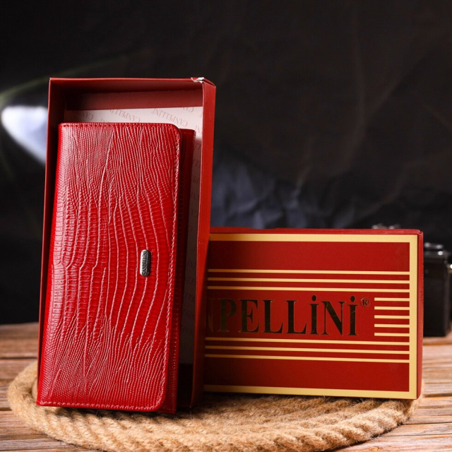Яскравий фактурний жіночий гаманець з натуральної шкіри з тисненням під рептилію. Аксесуар має три основні відділення, в які поміщаються купюри всіх номіналів, дві перегородки, одна з них на блискавці, одинадцять кишень для карток, одна з яких під сіточкою, монетниця на блискавці - зовні та одна прилегла кишеня. Закривається аксесуар клапаном на кнопку. Відмінний аксесуар, надійного виробника, який прослужить дуже довго.