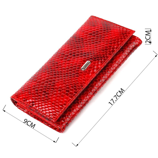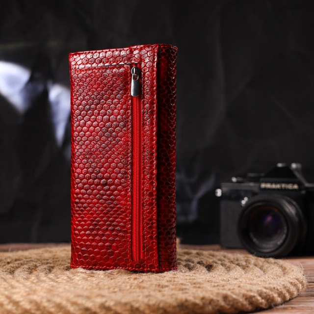Жіночий яскравий гаманець з натуральної фактурної шкіри з тисненням під змію. Аксесуар має три широкі відділення для купюр, з двома перегородками, одна перегородка закривається на блискавку, містку монетницю зовні, чотири приховані кишені та шість кишень для карток. Закривається аксесуар клапаном на кнопку. Якщо Ви хочете порадувати себе та здивувати близьких, то неодмінно купуйте шкіряні аксесуари в нашому магазині, якість і ціна Вас однозначно порадує.