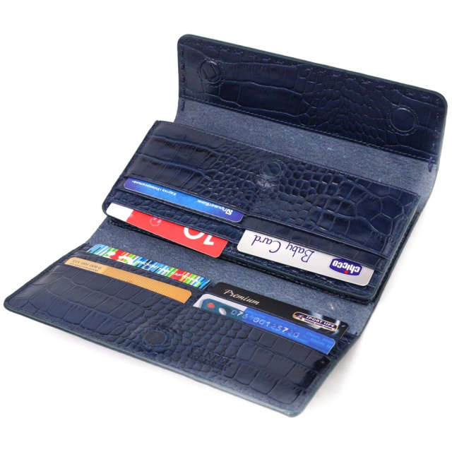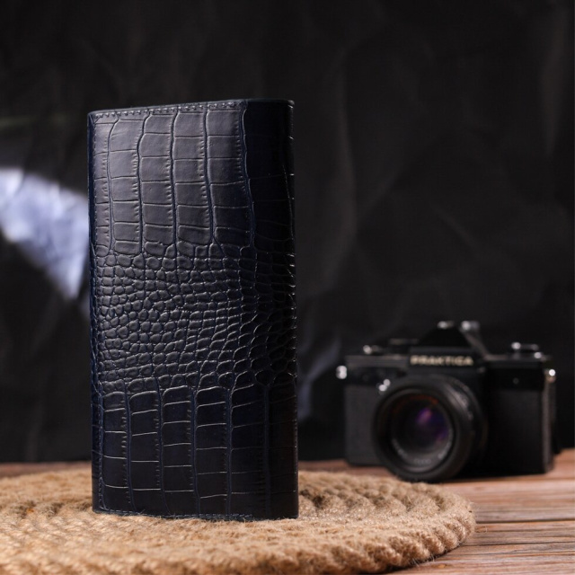 Модний жіночий гаманець з натуральної шкіри з тисненням під крокодила. Аксесуар має три відділення для купюр, монетницю, що закривається на блискавку, дві приховані кишені та дванадцять кишень для карток. Закривається аксесуар клапаном на магніти. Краї клапана декоровані рівним прошитим рядком у колір виробу. Якщо Ви хочете порадувати себе та здивувати близьких, то неодмінно купуйте шкіряні аксесуари в нашому магазині, якість і ціна Вас однозначно порадує.