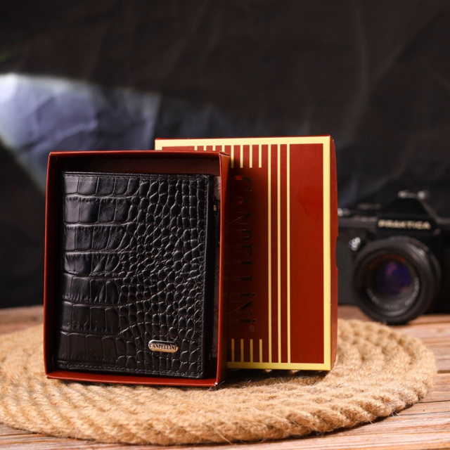 Компактний гаманець унісекс компактного розміру з натуральної шкіри, з тисненням під крокодила. Аксесуар має відділення для купюр, монетницю, що закривається на блискавку, дві приховані кишені та десять осередків для карток, один під сіточкою. Закривається аксесуар у два складання на кнопку. Якісний шкіряний аксесуар завжди вважався показником смаку та достатку, саме такі вироби представлені у нашому магазині, у нас кожен знайде щось для себе.