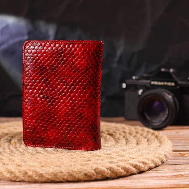 Лакований гаманець для жінок компактного розміру з натуральної шкіри, з тисненням під змію. Аксесуар має відділення для купюр з перегородкою, монетницю, що закривається клапаном на кнопку, приховану кишеню та сім відсіків для карток, два з них під сіточкою. Закривається аксесуар у два складання хлястиком на кнопку. Якісний шкіряний аксесуар завжди вважався показником смаку та достатку, саме такі вироби представлені у нашому магазині, у нас кожен знайде щось для себе.