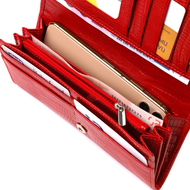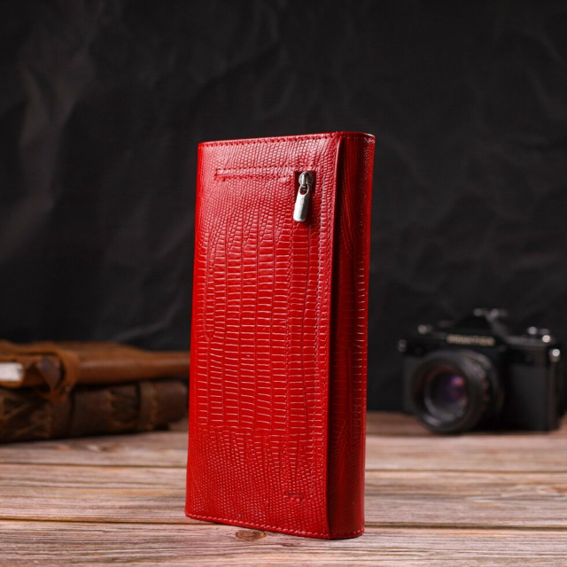 Яскравий фактурний жіночий гаманець з натуральної шкіри з тисненням під рептилію. Аксесуар має три основні відділення, в які поміщаються купюри всіх номіналів, дві перегородки, одна з них на блискавці, одинадцять кишень для карток, одна з яких під сіточкою, монетниця на блискавці зовні та одна прилегла кишеня. Закривається аксесуар клапаном на кнопку. Відмінний аксесуар, надійний виробник, який прослужить дуже довго.