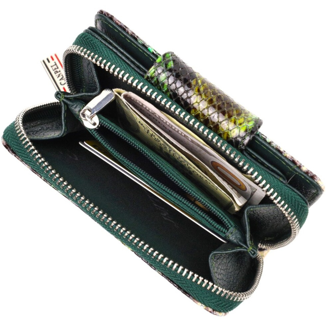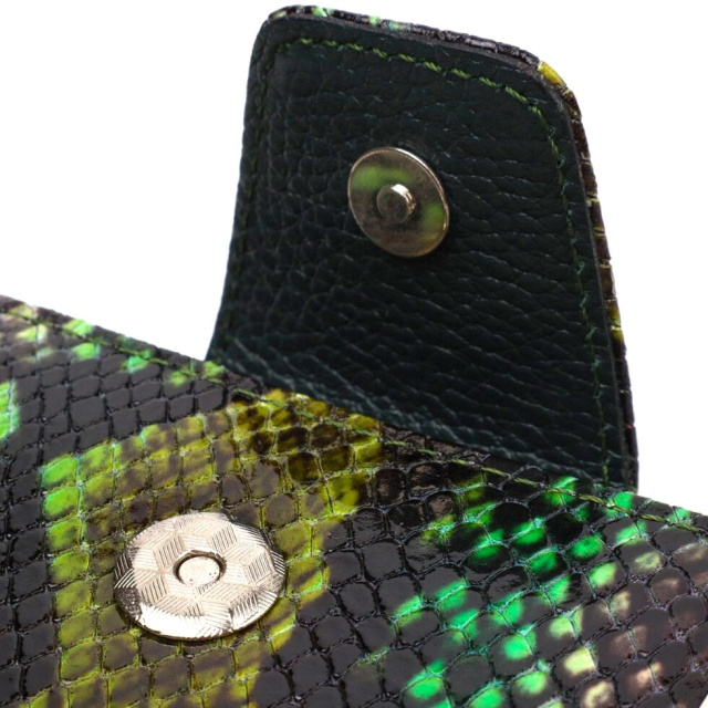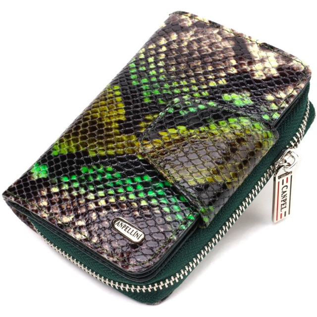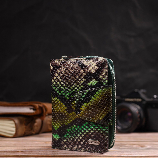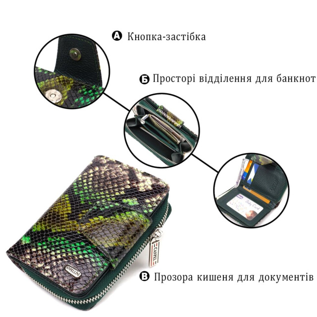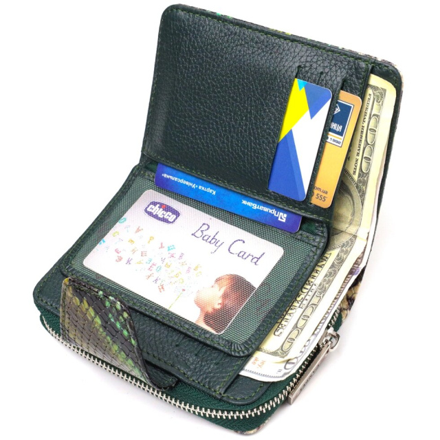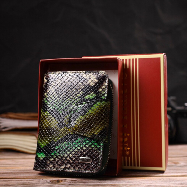 Розкішний жіночий гаманець вертикального типу із натуральної шкіри з тисненням під змію. Аксесуар має відділення для купюр, вісім осередків для карток (два під сіточкою), дві прилеглі кишені та дві кишені на блискавках. Закривається аксесуар навпіл хлястиком на магніт. Купуючи шкіряний аксесуар цієї фірми собі або на подарунок, будьте певні, що він радуватиме око не один рік.