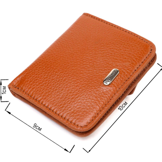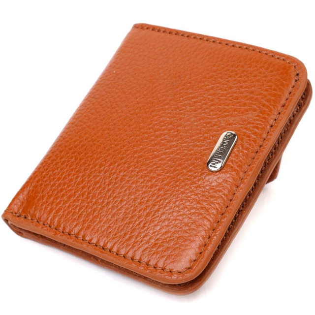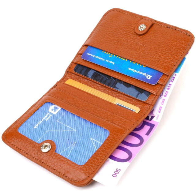 Практичний компактний гаманець із натуральної шкіри флотар, для стильних дівчат та жінок. Аксесуар має одне основне відділення з тканинною перегородкою в яке поміщаються купюри всіх номіналів, п'ять кишень для карток (одна під сіточкою), дві приховані кишені та монетницю. Закривається аксесуар навпіл на кнопку. На лицьовій стороні, вгорі посередині металевий логотип компанії виробника. Купуючи шкіряний аксесуар цієї фірми, собі чи на подарунок, будьте певні, що він прослужить Вам не один рік.