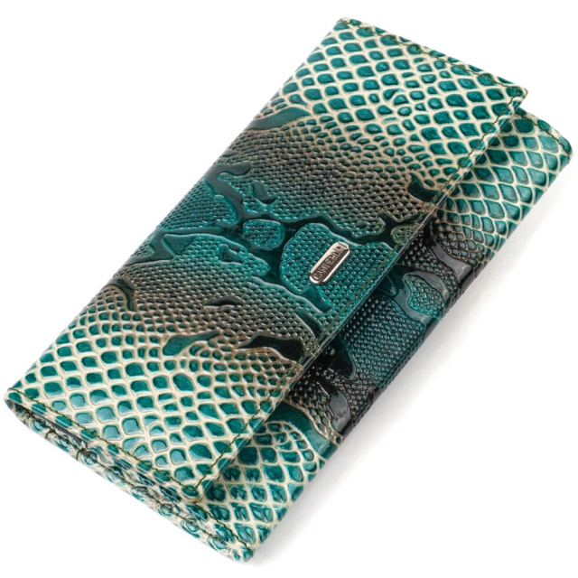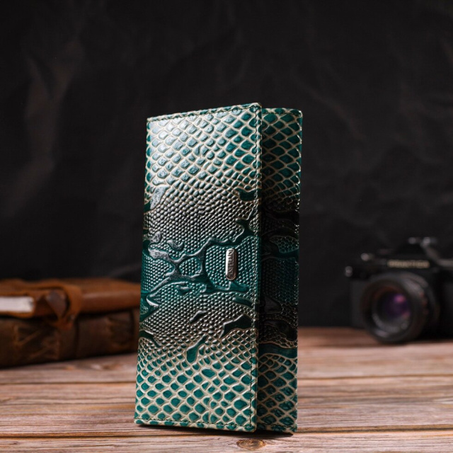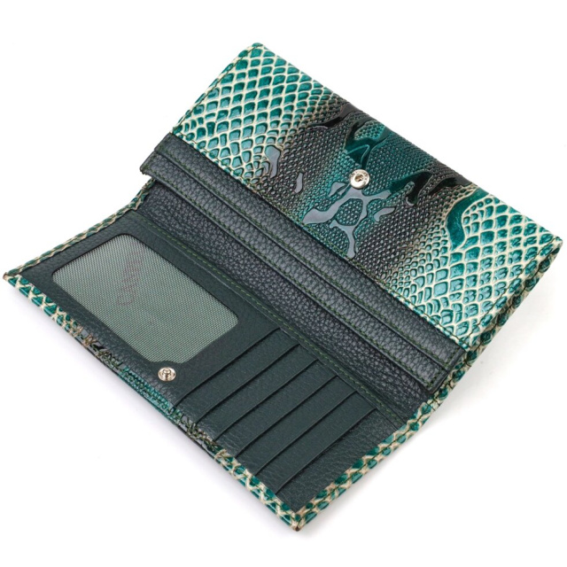 Незвичний фактурний жіночий гаманець горизонтального типу із натуральної шкіри. Аксесуар має одне основне відділення, шість кишень для карток (одна під сіточкою), одна прихована кишеня, три прилеглі кишені та монетниця. Закривається аксесуар клапаном на кнопку. Купуючи шкіряний аксесуар цієї фірми, собі чи на подарунок, будьте певні, що він прослужить Вам не один рік.