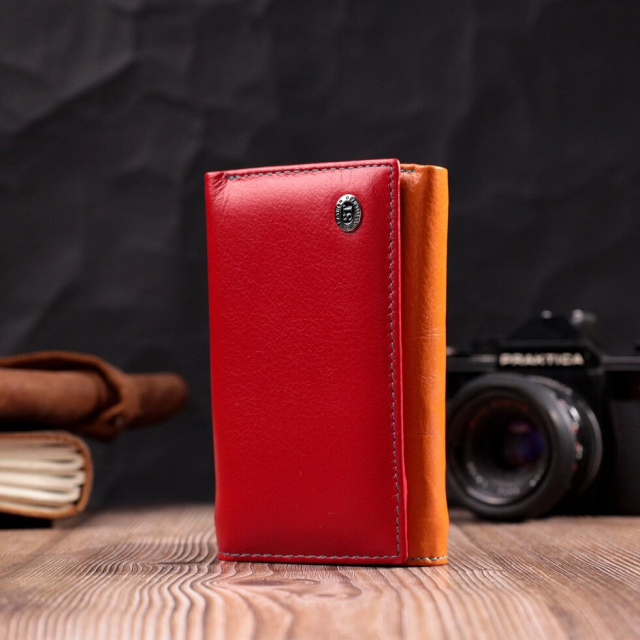 Стильне жіноче портмоне в три складання зручного середнього розміру з натуральної шкіри найвищої якості. Перше, що впадає в око це колірне рішення, замість однотонного аксесуара ми маємо різнокольоровий, який містить два основні зовнішні кольори - червоний і помаранчевий і кілька додаткових усередині. Перше, що впадає в око це колірне рішення, замість однотонного аксесуара ми маємо різнокольоровий, який містить два основні зовнішні кольори і кілька додаткових всередині. Шкіряне портмоне дуже практичне і служить досить довго. Аксесуар складається з двох містких кишень для купюр, кишені на блискавці через всю довжину, п'яти осередків для карт, прозорого віконця для пропуску та зовнішньої кишені на блискавці з перегородкою, що чудово прослужить для монет. Портмоне доповнено надійною фурнітурою. Укомплектований гаманець у фірмову картонну коробку білого кольору. Виріб стане ідеальним подарунком для дівчини будь-якого віку.