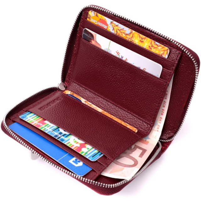 Відмінний гаманець для жінок середнього розміру із натуральної шкіри найвищої якості. Аксесуар складається з двох містких відділень для купюр, шести осередків для карт, двох прихованих кишень та зовнішньої кишені на блискавці, що чудово прослужить для монет. Зовні виріб прошитий рівним рядком по краю і прикрашений металевим логотипом компанії виробника, який розміщений вгорі посередині. Портмоне доповнено надійною фурнітурою та міцною підкладкою. Укомплектований гаманець у фірмову картонну коробку білого кольору. Виріб стане ідеальним подарунком для дівчини будь-якого віку.