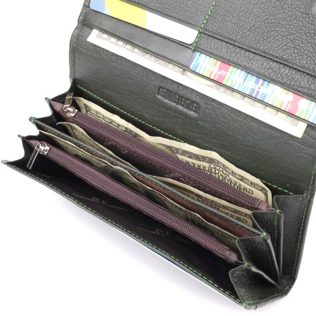 Практичне та надійне жіноче портмоне у два додавання, виконане з натуральної шкіри вищої якості. Аксесуар відрізняється продуманою функціональністю та високою зносостійкістю, завдяки чому стане вірним супутником на кожен день. Внутрішній простір організовано максимально зручно: чотири відділення для купюр, дві довгі кишені на блискавці, вісім осередків для пластикових карток, прихована внутрішня кишеня, а також зовнішня кишеня на блискавці, що ідеально підходить для монет. Лицьова сторона прикрашена тисненим логотипом бренду, що підтверджує оригінальність та якість виробу. Внутрішнє оздоблення поєднує натуральну шкіру із щільним текстилем. Портмоне доповнено надійною фурнітурою та постачається у фірмовій картонній коробці білого кольору – відмінний вибір як для себе, так і подарунок.
