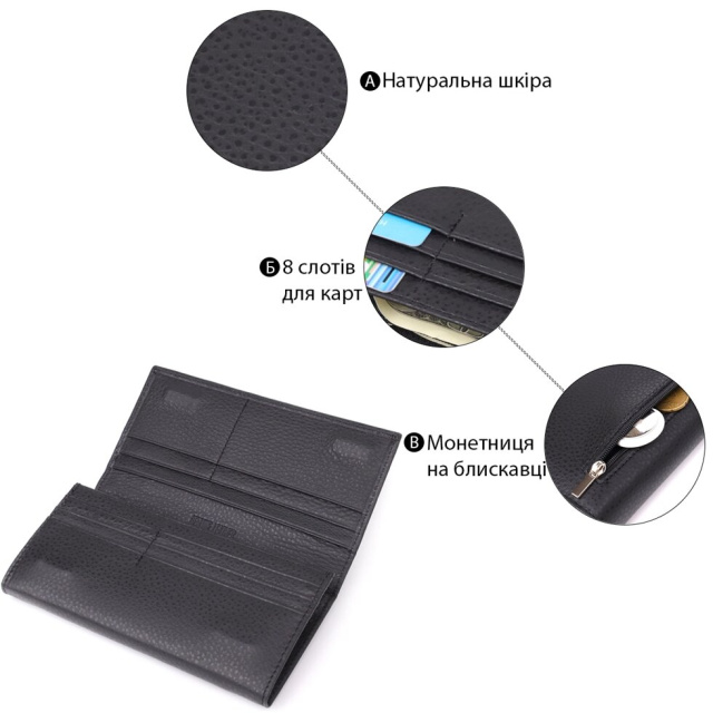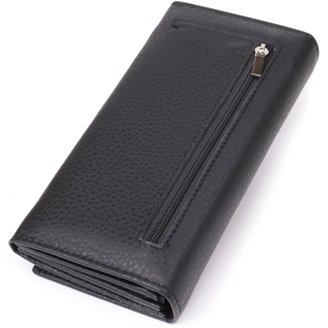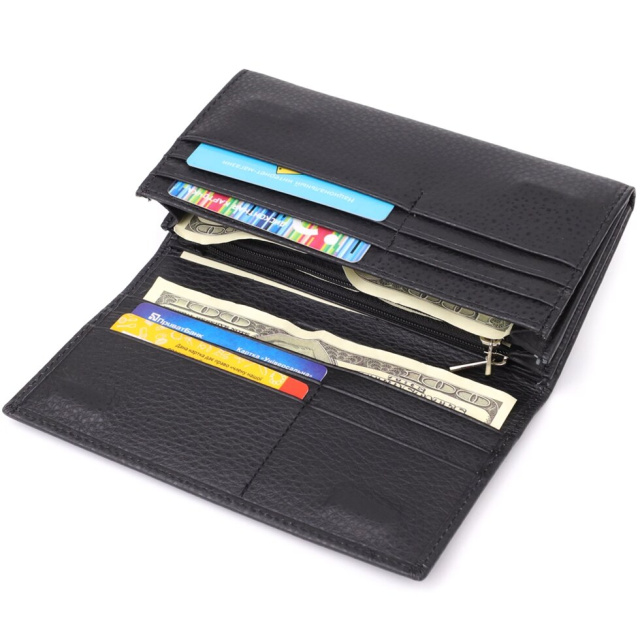 Місткий гаманець для жінок які цінують якість та практичність. Аксесуар з натуральної добротної шкіри, він складається з трьох містких відділень для купюр, двох кишень на блискавках, однієї кишені під плівкою, восьми осередків для пластикових карток, двох прихованих кишень та кишені для монет зовні. У нижньому правому кутку знаходиться акуратний металевий логотип бренду, що підтверджує оригінальність та якість виробу. Портмоне доповнено надійною фурнітурою та міцною підкладкою. Запакований гаманець у фірмову картонну коробку білого кольору.
