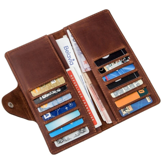 Вертикальний чоловічий шкіряний гаманець з класичним дизайном коричневого кольору. Виріб відрізняється своєю міцністю і шикарним зовнішнім виглядом. Доповнено гаманець сріблястою фурнітурою. Закривається модель на дві кнопки - ви можете самостійно регулювати наповненість виробу, закривши його на ближню або дальню кнопку. Виріб поміститься в ваш портфель або сумку, не має важкої ваги. Прекрасно лежить в руці. На лицьовій стороні тиснений логотип бренду. Якщо ви в пошуках подарунка - радимо вам дану модель - вона доступна в різних кольорах і є дуже виграшним рішенням для подарунка близькій людині.