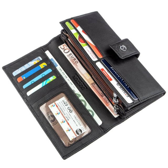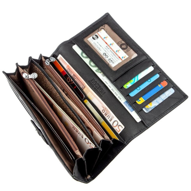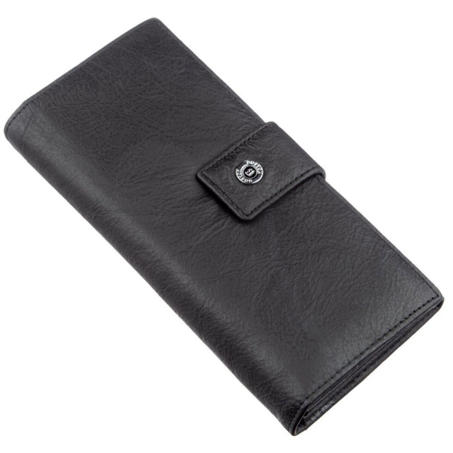 Шикарний жіночий гаманець з висококласної натуральної шкіри, яка порадує Вас своєю м'якою і ніжною фактурою. Колір цього гаманця чорний, який відмінно підійде для прагматичних та ділових жінок будь-якого віку. В даному аксесуарі є чотири великих відділення для купюр і документів, відділення на блискавці для різних цінностей, кишені для кредитних і візитних карток, а також на тильній стороні є відділення для монет або інших дрібниць, які вимагають швидкого доступу до них. Закривається гаманець на зручну і практичну кнопку. Упаковано виріб у білу щільну картонну коробку з фірмовим логотипом.