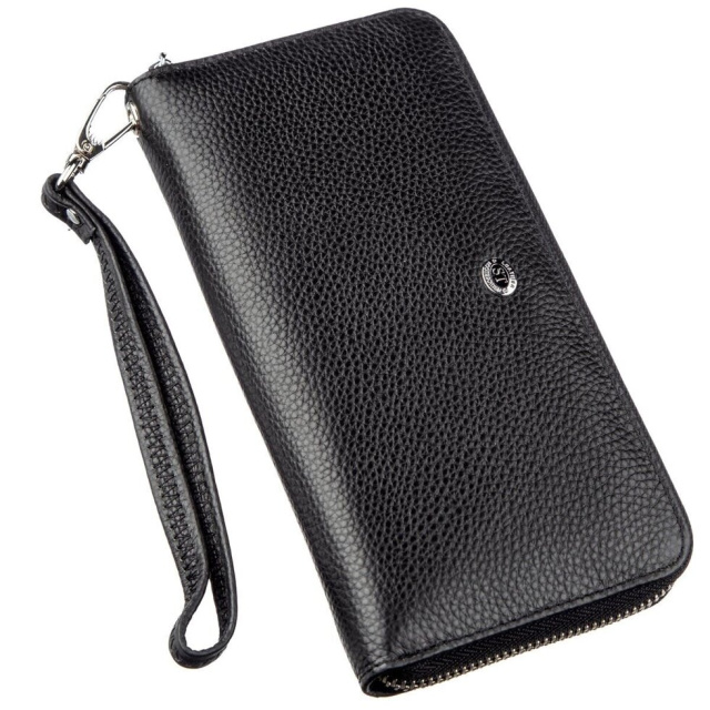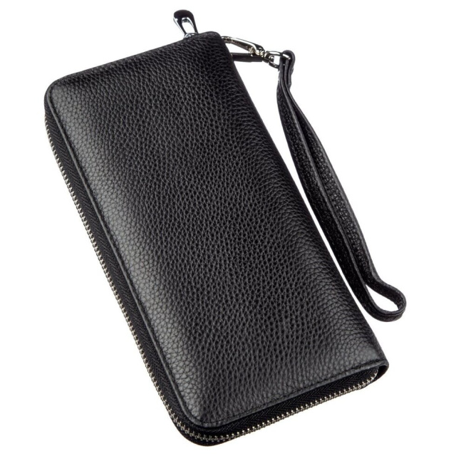 Витончений жіночий клатч чорного кольору з натуральної високоякісної шкіри. Дуже практичний і багатофункціональний, має достатню кількість необхідних відділень і кишень для купюр, карт, документів та інших цінностей. Можна носити в сумці, портфелі або як самодостатній аксесуар за допомогою ремінця ана зап'ястя, що знімається. Такий клатч прикрасить жінку будь-якого віку та соціального стану. Підкреслить її відмінний смак і почуття стилю. Купуйте цей виріб для себе або зробіть неповторний подарунок дорогій людині. При покупці клатч буде упакований в картонну фірмову коробку білого кольору.