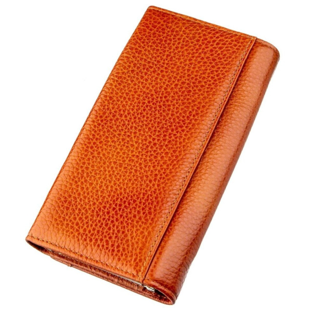 Жіночий шкіряний гаманець горизонтального типу з натуральної шкіри яскравого оранжевого кольору. Аксесуар приємний і м'який на дотик. По краях прошитий рівним рядком. На лицьовій стороні, на клапані, є тиснення бренду. Виріб доповнено найнеобхіднішим функціоналом: монетницею з міцним фіксатором, слотами для карток і просторими відділеннями під купюри. У нашому магазині ви зможете знайти дану модель в різних кольорах і схожих дизайнах за найдоступнішою вартості. Такий гаманець стане прекрасним подарунком для будь-якої дівчини.