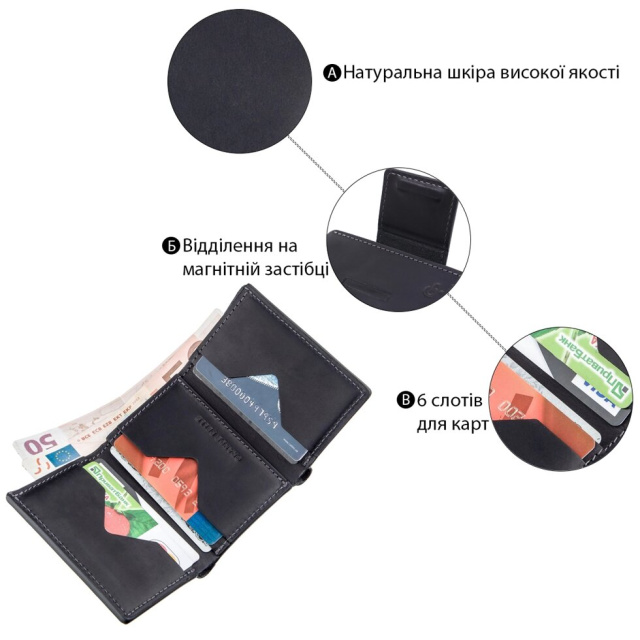 Компактне вінтажне ортмоне в класичному стилі. Аксесуар має одне відкрите відділення для купюр і кілька фіксованих відсіків для кредиток. Модель закривається на хлястик з магнітною кнопкою. На лицьовій стороні моделі є тиснений логотип виробника. Портмоне стане ідеальною знахідкою для тих, хто любить компактні аксесуари і вважає за краще носити з собою багато карток.