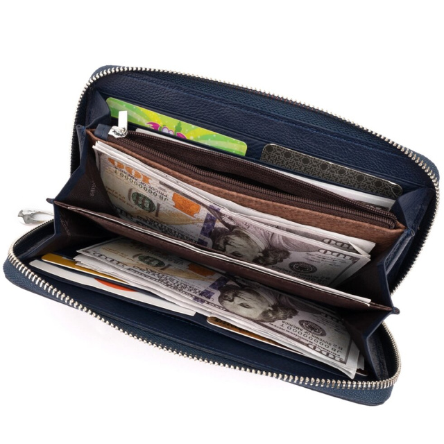 Найзручніший і найголовніше місткий жіночий гаманець. Виконана модель в темно-синьому приглушеному кольорі з натуральної м'якої та еластичноїшкіриі. В моделі дві автономних частини (під купюри і друга під кредитки). Гаманець ви можете носити як клатч за допомогою ремінця на зап'ясті. Його сучасний і продуманий дизайн не залишить вас байдужими. З таким виробом ви можете бути впевнені, що купюри не помнуться і будуть в повному порядку. Варто відзначити, що в моделі досить відділень, щоб розкласти все гроші картки і навіть вмістити телефон. Усередині виріб виготовлений з натуральної шкіри в поєднанні з щільним текстилем. Гаманець упакований в фірмову картонну коробку білого кольору. Рекомендуємо вам дану модель, якщо ви перебуваєте в пошуку подарунка для дівчини.