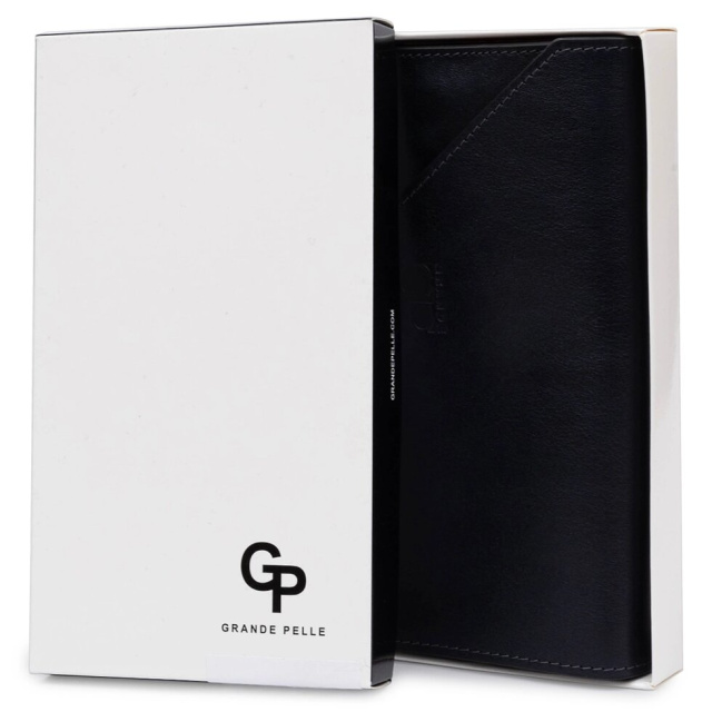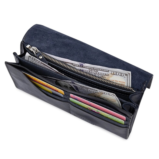 Шикарний гаманець в темно-синьому кольорі з натуральної шкіри, якість якої відчувається відразу, як тільки даний аксесуар потрапляє в руки. Усередині гаманця є місткі відділення для купюр, вісім слотів для пластикових і візитних карток, а також відділення на блискавці для монет або інших цінностей. Упаковано портмоне в фірмову коробку з картону.