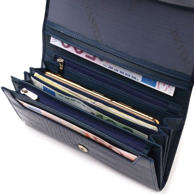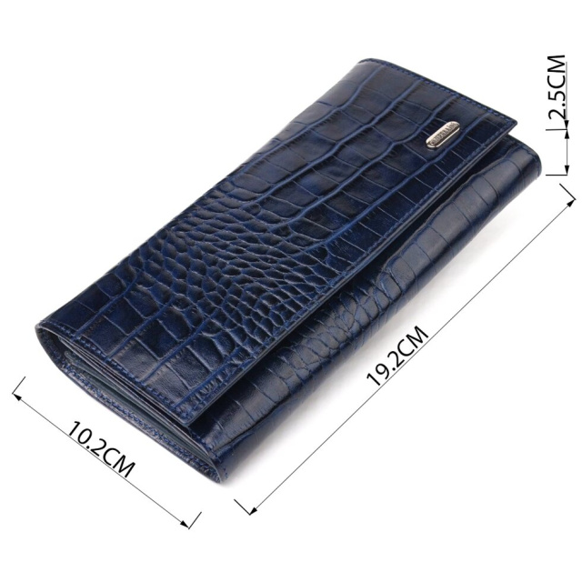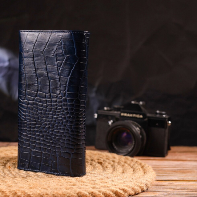 Чудовий горизонтальний жіночий гаманець з натуральної фактурної шкіри з тисненням під крокодила. Аксесуар має три великі кишені для купюр, три прилеглі кишені, вісім осередків для карток, три з них під сіточкою, монетницю на блискавці. Виріб закривається клапаном на кнопку. Відмінна ідея для подарунка, яка не залишить байдужою жодну жінку.