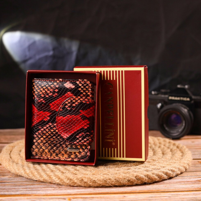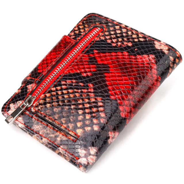 Стильний жіночий гаманець компактного розміру з натуральної шкіри з тисненням під змію. Аксесуар має відділення для купюр, монетницю, що закривається на блискавку, три приховані кишені та чотири відсіки для карток, один під сіточкою. Закривається аксесуар клапаном на кнопку. Якісний шкіряний аксесуар завжди вважався показником смаку та достатку, саме такі вироби представлені у нашому магазині, у нас кожен знайде щось для себе.