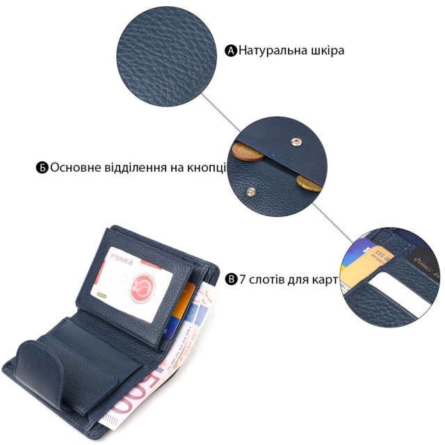 Практичний жіночий гаманець компактного розміру із натуральної шкіри. Аксесуар має відділення для купюр з перегородкою, монетницю, що закривається клапаном на кнопку, приховану кишеню та сім відсіків для карток, два з них під сіточкою. Закривається аксесуар у два складання хлястиком на кнопку. Якісний шкіряний аксесуар завжди вважався показником смаку та достатку, саме такі вироби представлені у нашому магазині, у нас кожен знайде щось для себе.