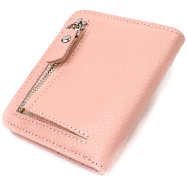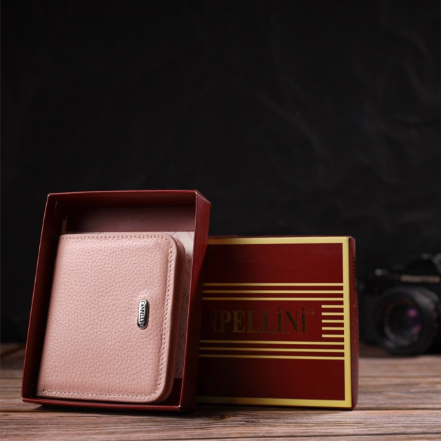 Чудовий компактний гаманець із натуральної шкіри для суперстильних дівчат та жінок. Аксесуар має одне основне відділення з тканинною перегородкою в яке поміщаються купюри всіх номіналів, п'ять кишень для карток (одна під сіточкою), дві приховані кишені та монетницю. Закривається аксесуар навпіл на кнопку. На лицьовій стороні, вгорі посередині металевий логотип компанії виробника. Купуючи шкіряний аксесуар цієї фірми, собі чи на подарунок, будьте певні, що він прослужить Вам не один рік.